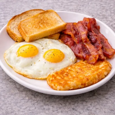 59. Two Eggs, Bacon (4) or Ham (2 ) or Sausage (4), Toast, & Hash Brown
