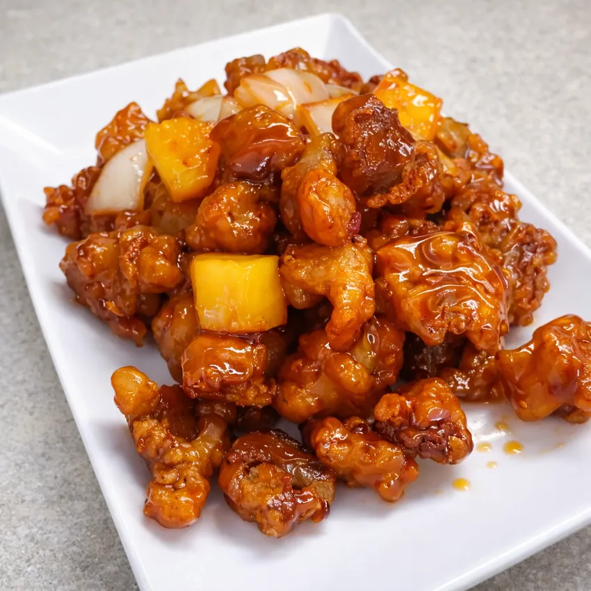 Double-fried crunchy pork shoulder tossed with vibrant bell peppers, onions, and pineapple in our signature tangy-sweet glaze.