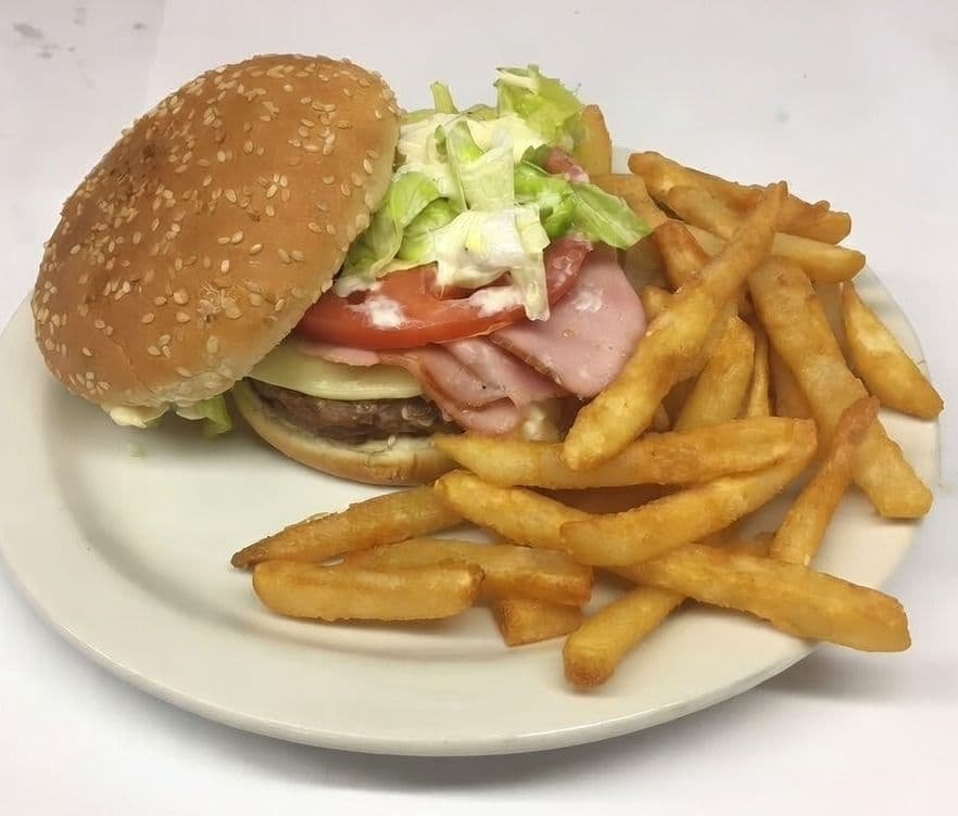 A juicy beef patty topped with melted cheese, fresh lettuce, tomato, and slices of ham, served with a side of crispy French fries.